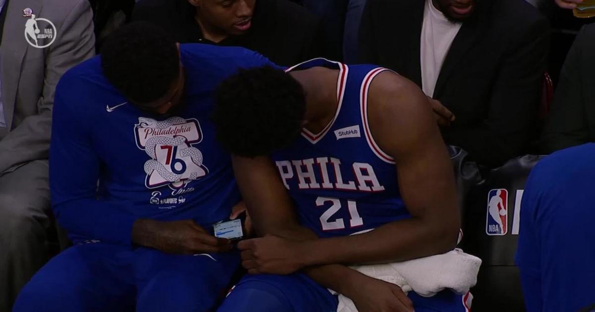 Амир Джонсон и Джоэл Эмбиид пользовались телефоном на скамейке запасных во время 1-го матча с «Бруклином»