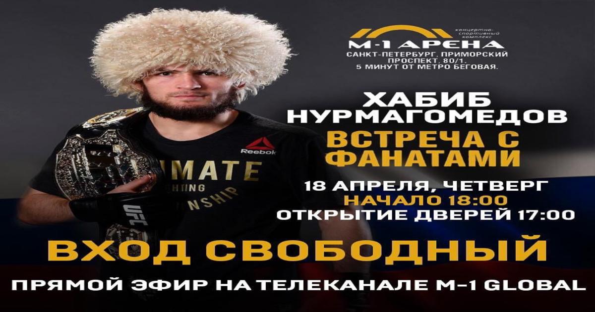 Чемпион UFC Хабиб Нурмагомедов проведет открытую встречу с болельщиками. Мероприятие пройдет на «М-1 Арена» в Санкт-Петербурге 18 апреля.