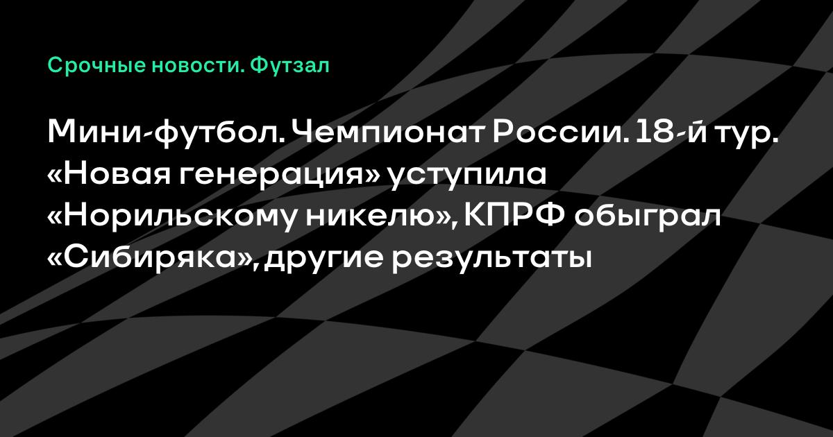 Прошли матчи 18-го тура чемпионата России по мини-футболу. «Новая генерация» уступила «Норильскому никелю» (3:4), КПРФ обыграл «Сибиряка» (10:0).