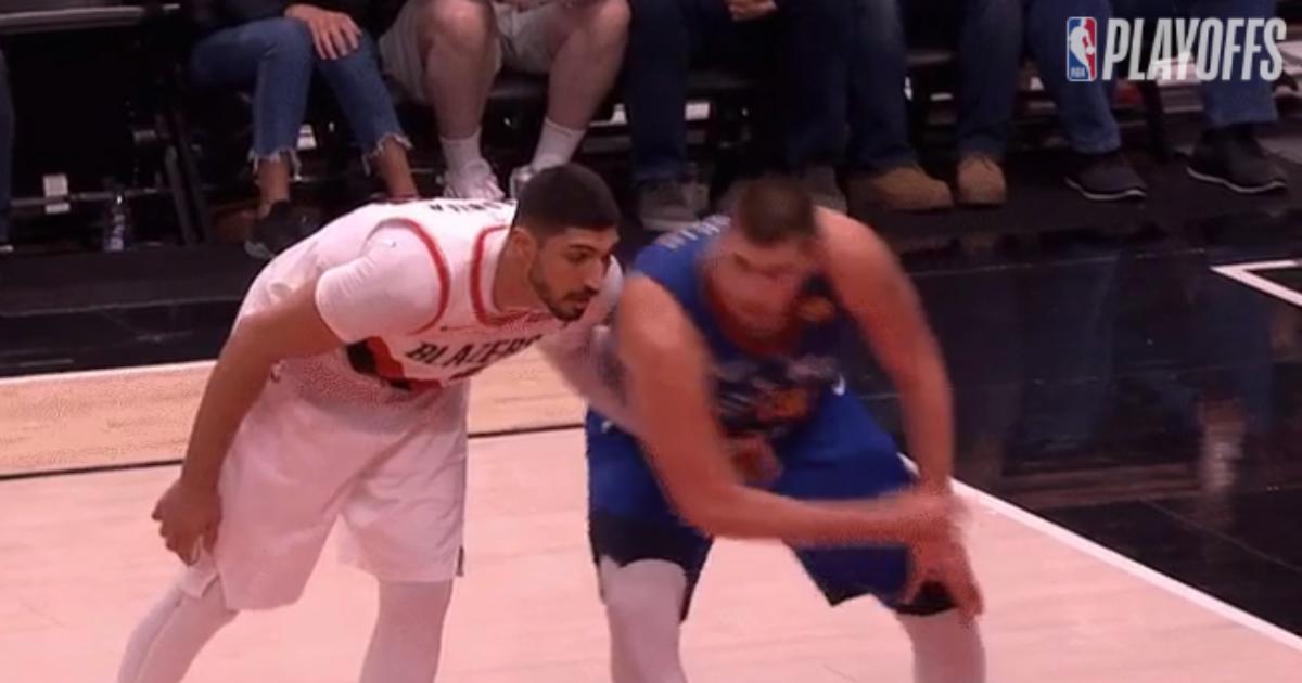 Центровой «Наггетс» Никола Йокич во время борьбы за подбор в 3-м матче серии с «Блэйзерс» ударил пятого номера соперника Энеса Кантера по больному плечу.