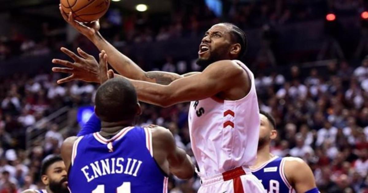 Форвард «Торонто» Кавай Ленард в 3-й четверти матча с «Филадельфией» прошел под кольцо и забил сверху через центрового соперника Джоэла Эмбиида.