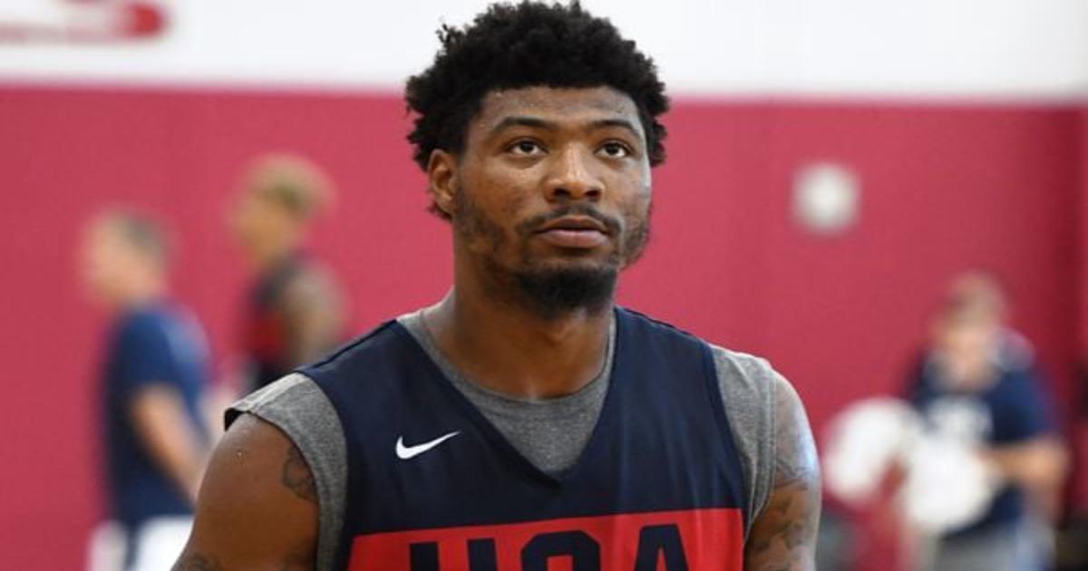 Защитник сборной США и «Бостона» Маркус Смарт во время тренировки исполнил оригинальный дальний бросок, стоя спиной к кольцу.