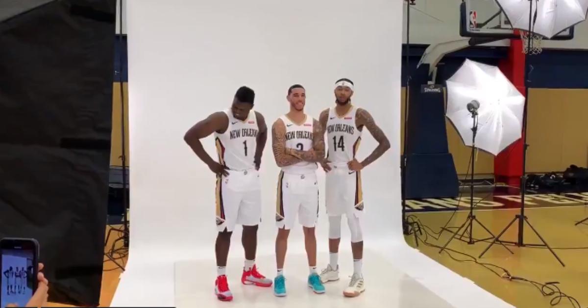 Молодые игроки команды Лонзо Болл, Брэндон Ингрэм и Зайон Уильямсон предстали перед камерами для совместной фотографии.
