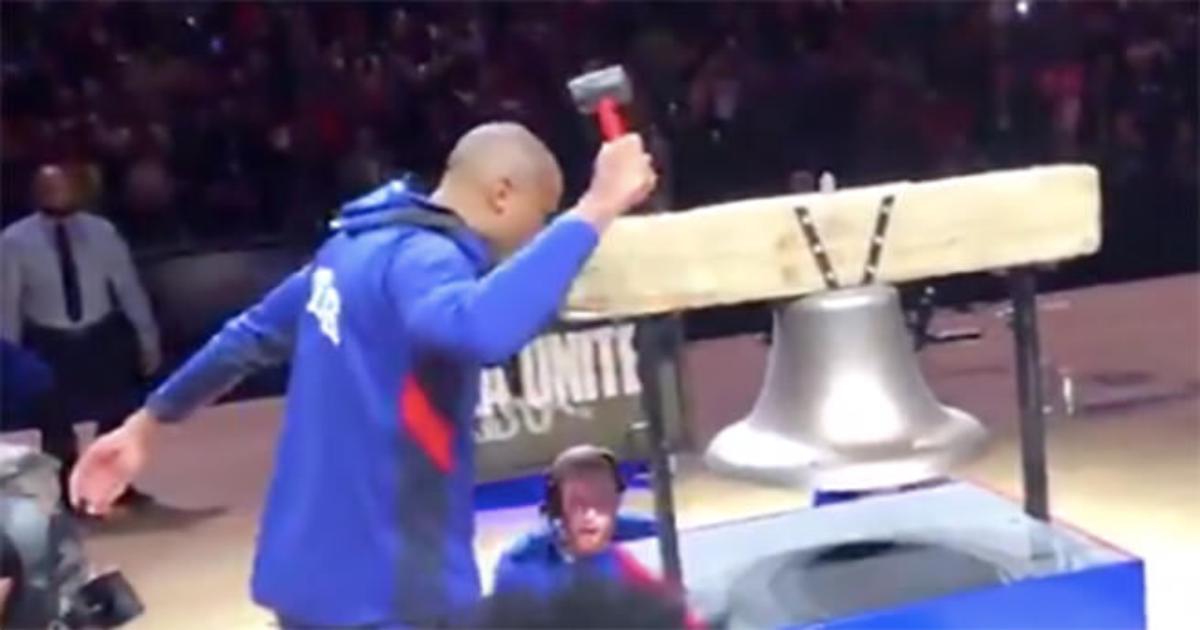 Тяжелый форвард «Филадельфии» Эл Хорфорд ударил в Колокол Свободы перед началом первого матча сезона против «Бостона».
