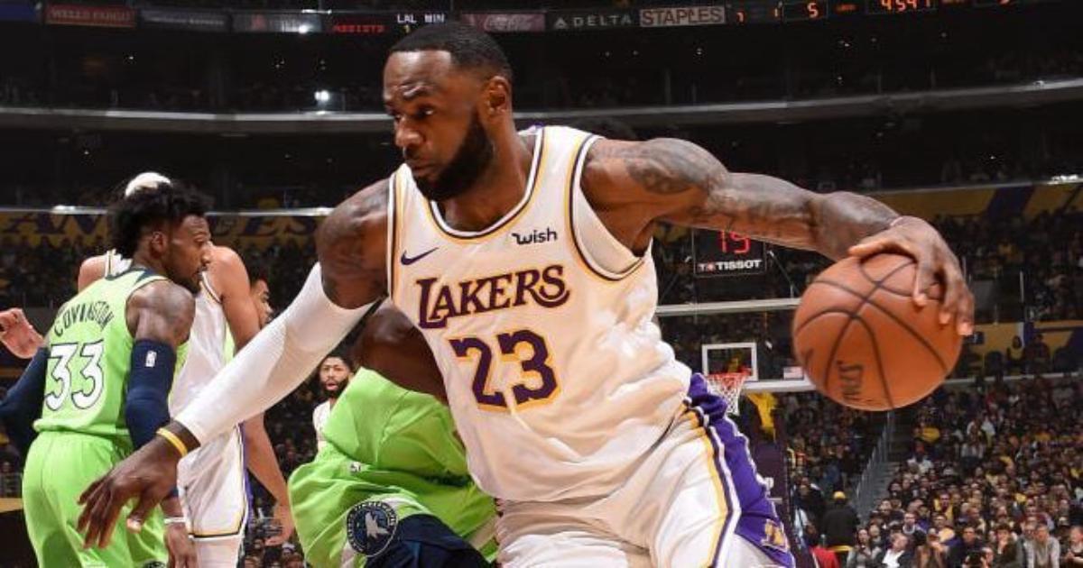 Форвард «Лейкерс» Леброн Джеймс во 2-й четверти матча с «Миннесотой» прошел к кольцу и вколотил сверху одной рукой через центрового соперника Горги Дженга.