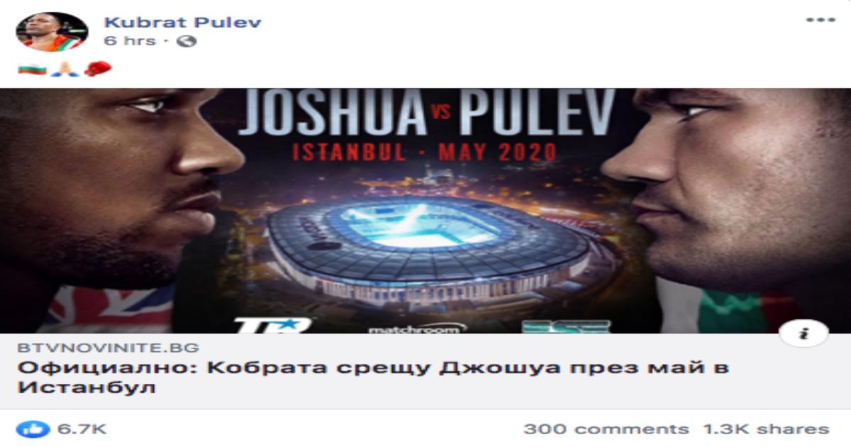 Пулев в фейсбуке репостнул инсайд, что его бой с Джошуа состоится в мае в Стамбуле