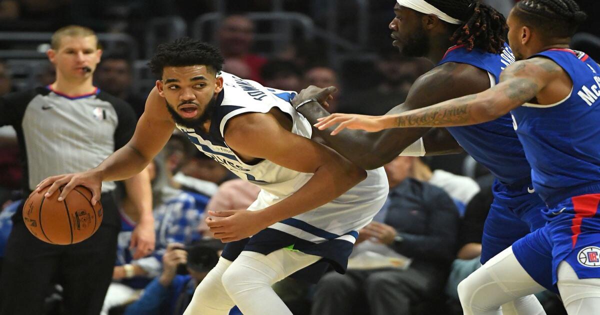 Центровой «Миннесоты» Карл-Энтони Таунс в третьей четверти матча с «Клипперс» прошел под кольцо и исполнил эффектный данк одной рукой через Кавая Ленарда.