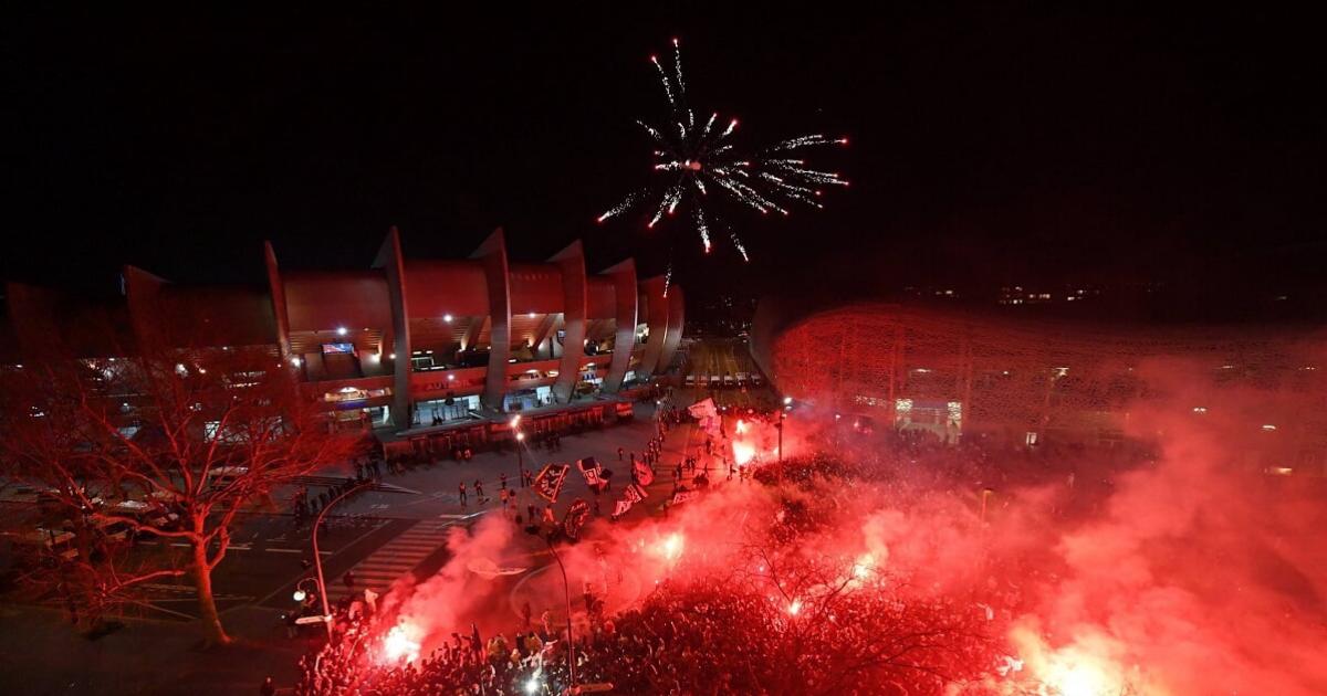 Болельщики «Пари Сен-Жермен» жгут петарды, празднуя голы команды.