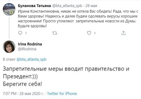 В диалоге с одной из женщин Роднина заявила, что ограничения вводят не члены Госдумы, а правительство и президент. При этом экс-фигуристка допустила ошибку, написав «презедент».