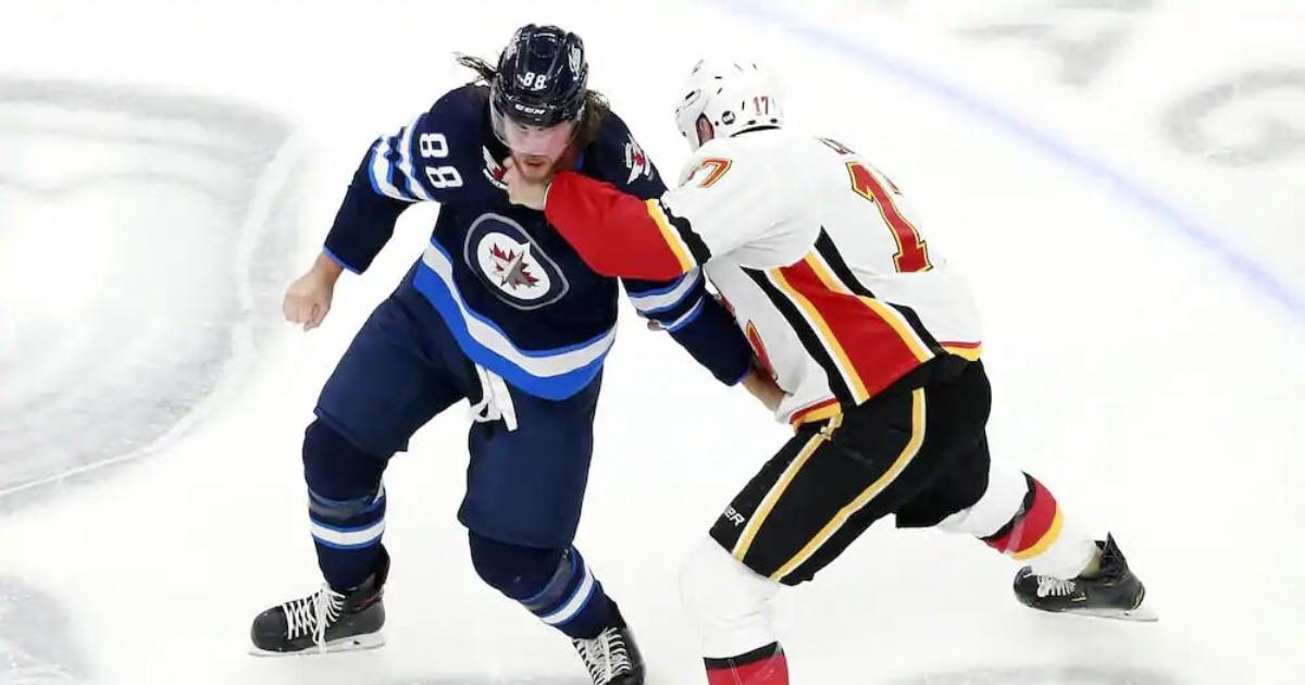 Защитник «Джетс» Нэтан Болье и нападающий «Флэймс» Милан Лучич сбросили краги сразу же после стартового вбрасывания в первом периоде.