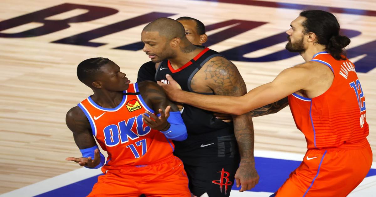 Центровой «Хьюстона» Пи Джей Такер и разыгрывающий «Оклахомы» Деннис Шредер были удалены с площадки за стычку в третьей четверти пятого матча серии первого раунда плей-офф.