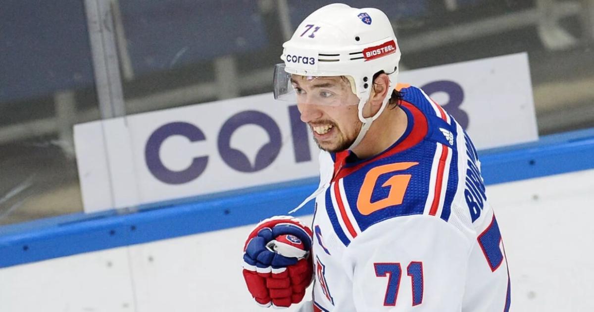 Нападающий СКА Антон Бурдасов отличился в матче регулярного чемпионата КХЛ против «Авангарда».