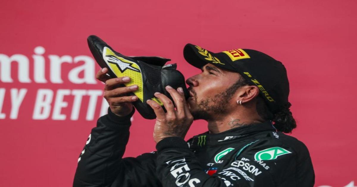 На подиуме Гран-при Эмилии-Романьи пилот «Мерседеса» присоединился к Даниэлю Риккардо из «Рено», выпив шампанское из ботинка.