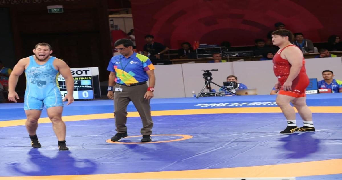 В весовой категории до 125 килограмм лучшим стал Олег Болтин из Восточно-Казахстанской области. В финале он встретился с бронзовым призером Олимпиады-2012 Даулетом Шанбайем – 11:0.