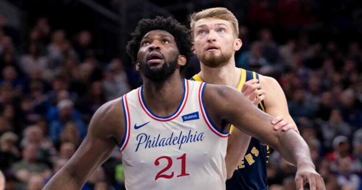 Центровой «Сиксерс» Джоэл Эмбиид продемонстрировал уверенную защиту против еще одного участника Матча звезд-2021, форварда «Индианы» Домантаса Сабониса.