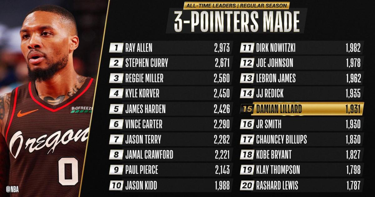 Дэмиан Лиллард вышел на 15-е место по реализованным 3-очковым в НБА