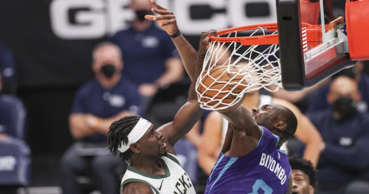 Разыгрывающий «Милуоки» Дрю Холидэй в третьей четверти матча против «Шарлотт» прошел по центу и забил сверху одной рукой через центрового Бисмака Бийомбо.
