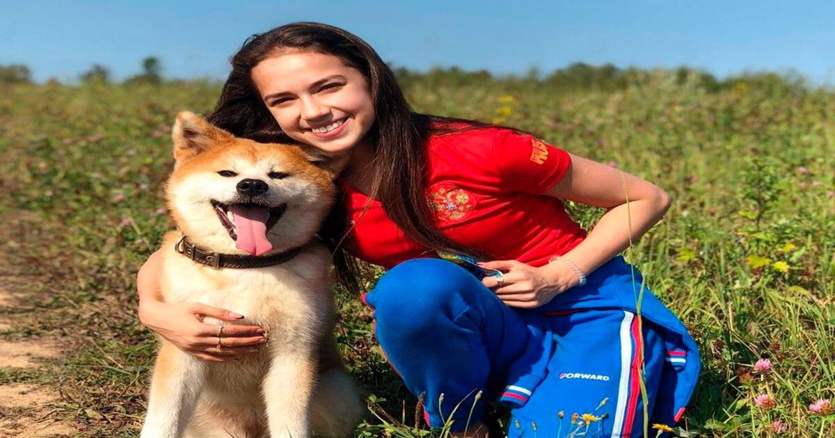 Фигуристка сфотографировалась в коричневом плаще. С ней запечатлены ее домашние животные – акита-ину Масару и мальтипу Шанти.