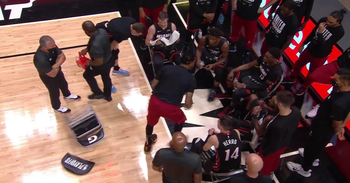 Форвард «Майами» Юдонис Хаслем сломал стул, пытаясь воодушевить свою команду во время тайм-аута в четвертом матче серии плей-офф против «Милуоки».