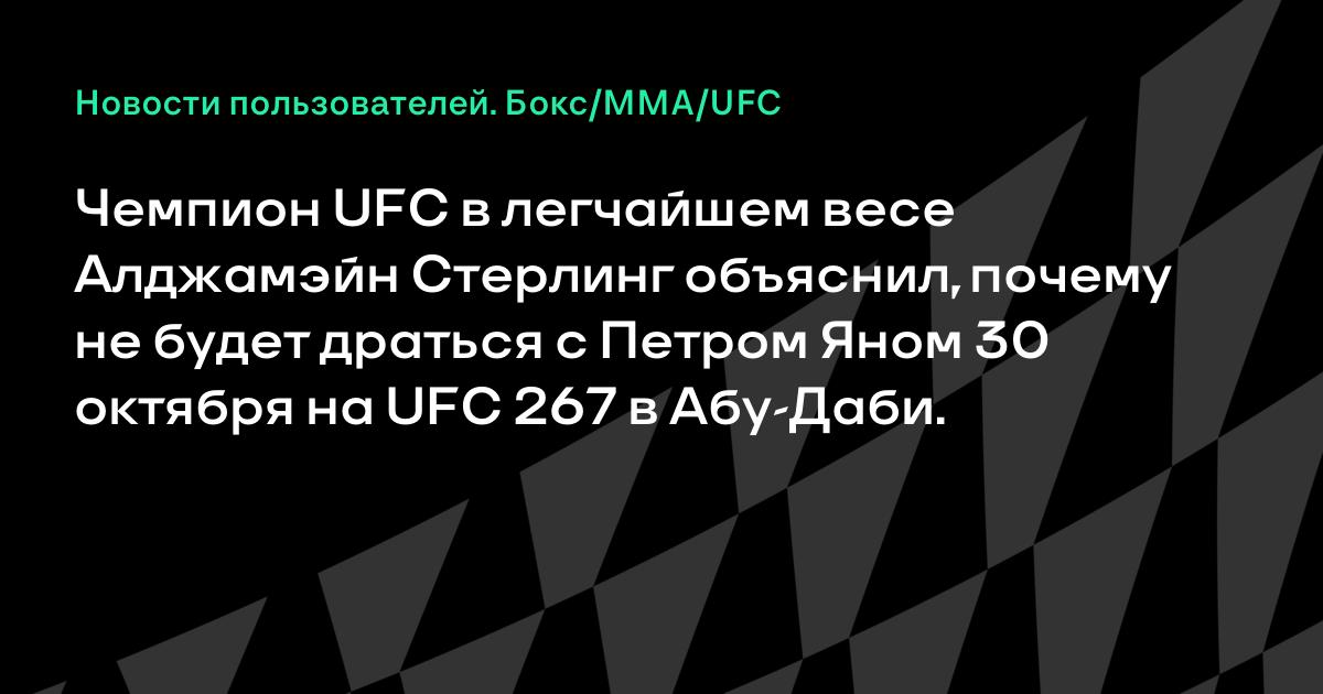 Чемпион UFC в легчайшем весе Алджамэйн Стерлинг объяснил, почему не будет драться с Петром Яном 30 октября на UFC 267 в Абу-Даби.