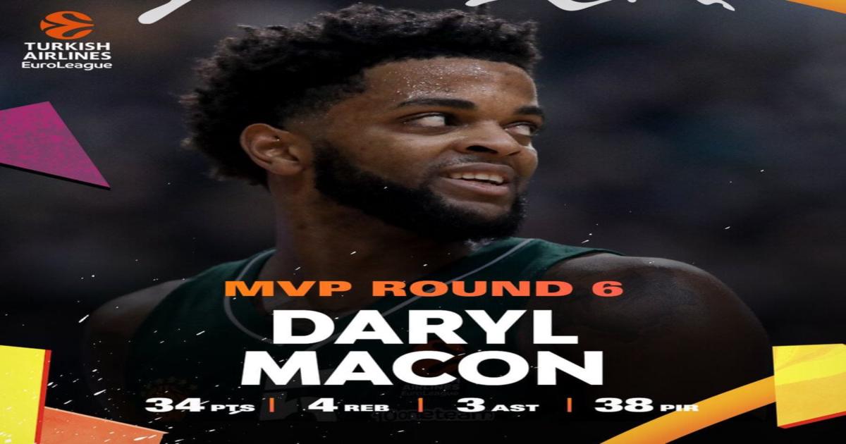 Разыгрывающий греческого «Панатинаикоса» Дэрил Мэйкон признан самым ценным игроком 6-го раунда регулярного чемпионата Евролиги.