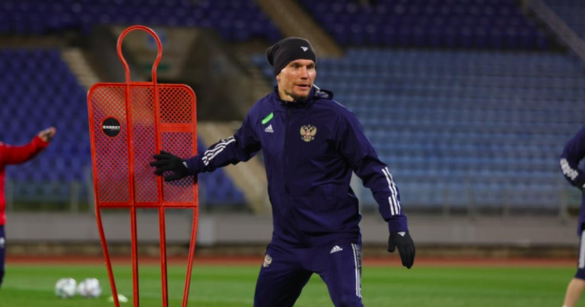 Пресс-служба сборной России опубликовала фото форварда ЦСКА Антона Заболотного с тренировки – игрок на поле рядом с манекеном.