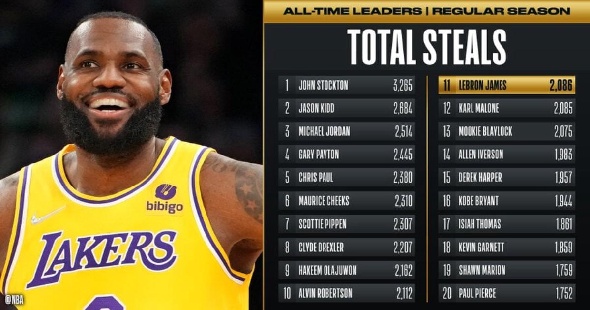 Форвард «Лейкерс» Леброн Джеймс в четверг вышел на 11-е место в истории НБА по перехватам за карьеру.