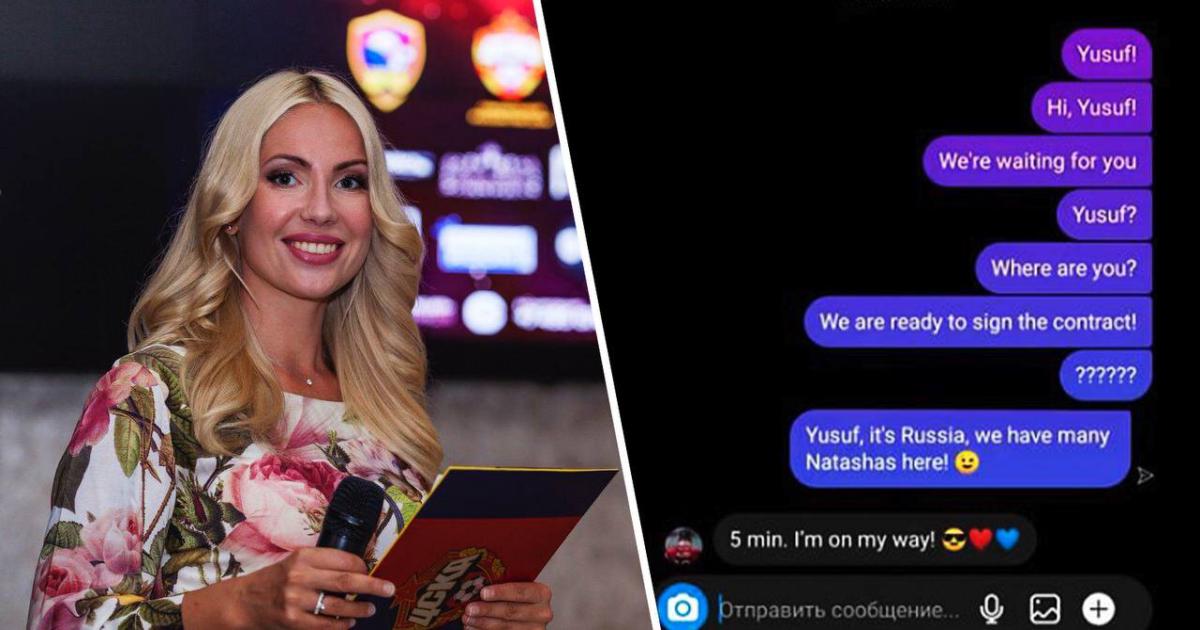 Турецкий футболист не отвечает на вопросы, после чего ЦСКА пишет ему: «Юсуф, это Россия, у нас тут много Наташ». И моментально поступает ответ: «Пять минут, уже еду!»