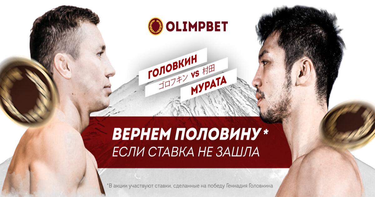 9 апреля Геннадий Головкин и Рета Мурата в Сайтаме проведут объединительный бой за титул чемпиона мира по версиям IBF и WBA Super. Букмекерская компания Olimpbet вернет 50% от ставки на победу Головкина, если он не сможет победить Мурату. Причем не в виде фрибета, а деньгами на игровой счет. Акция действует как для ординаров, так и для экспрессов, в которых есть ставка на победу казахстанского бойца.