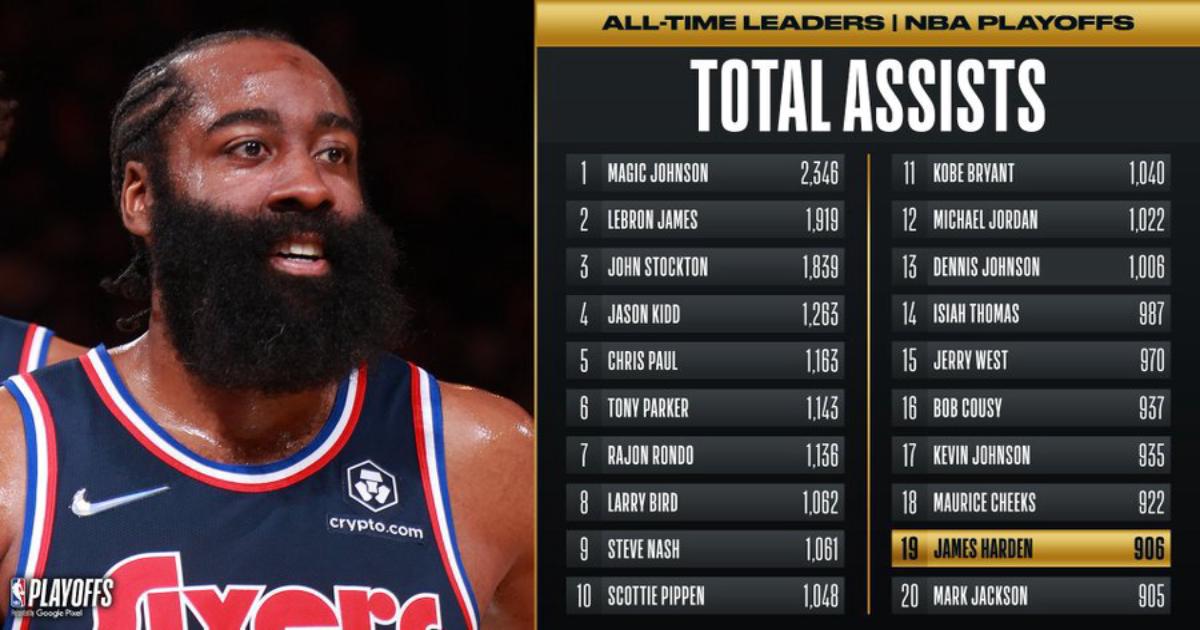 Защитник «Филадельфии» Джеймс Харден в воскресенье поднялся на 19-е место по количеству результативных передач в плей-офф.