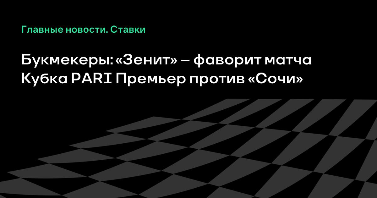 Аналитики PARI видят в «Зените» фаворита предстоящей игры. Ставки на победу петербургской команды в основное время игры принимаются по коэффициенту 1.62, что соответствует примерно 60% вероятности. Поставить на ничью можно за 4.40 (около 22%), в то время как победа «Сочи» оценивается коэффициентом 5.50 (примерно 18%).