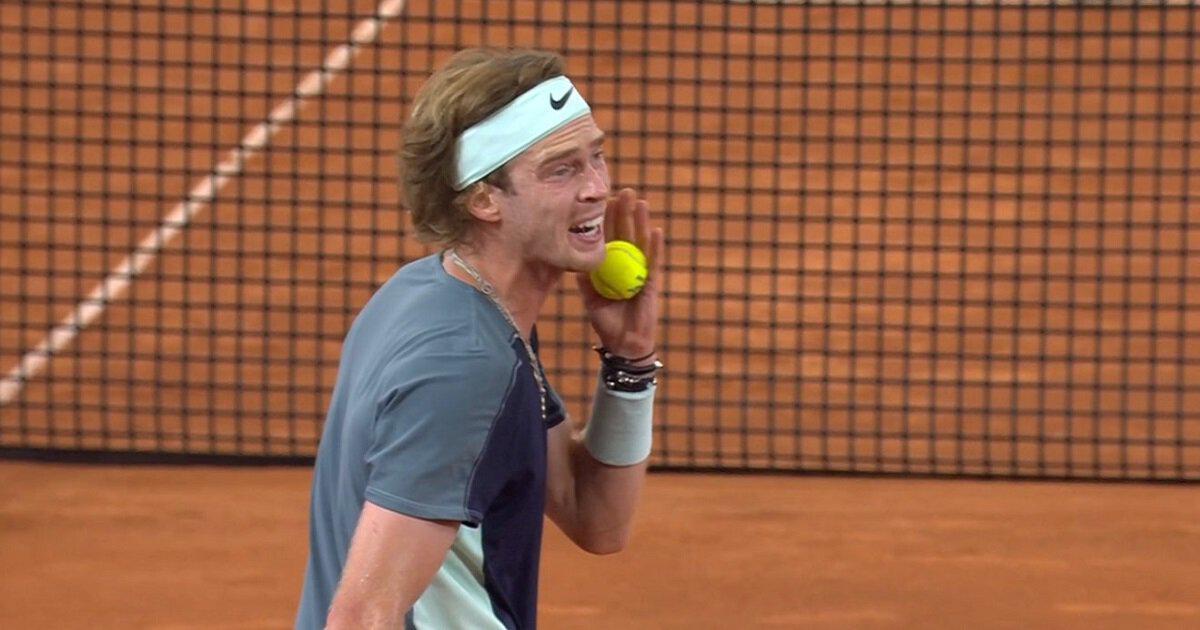 В начале второго сета Рублева сразу проиграл свою подачу, после чего хотел выбить мяч на трибуны. Но это привело бы к штрафу на гейм, так что он просто его укусил.