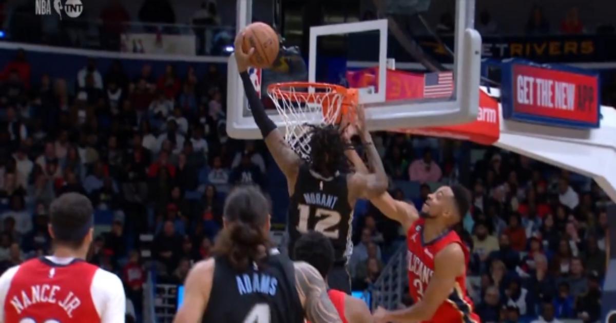 Звездный разыгрывающий «Мемфиса» Джа Морэнт во время матча против «Нового Орлеана» (102:113) исполнил красивый данк через Си Джей Макколлума.