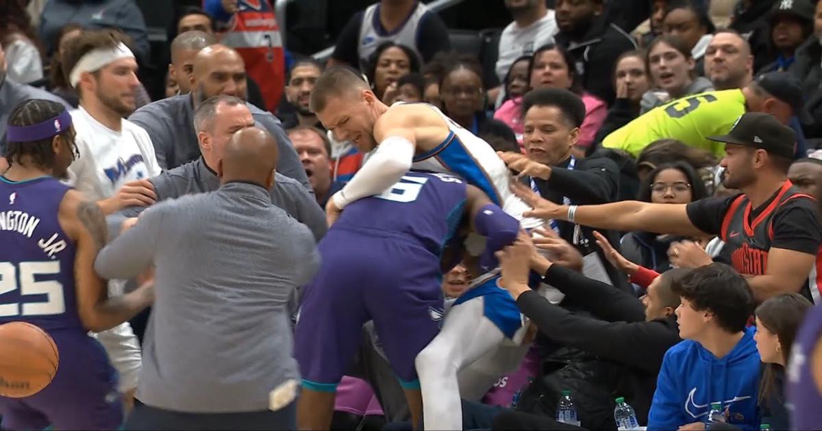 Форварды Кристапс Порзингис («Вашингтон») и Джален Макдэниэлс («Шарлотт») сцепились во время матча между командами в воскресенье.