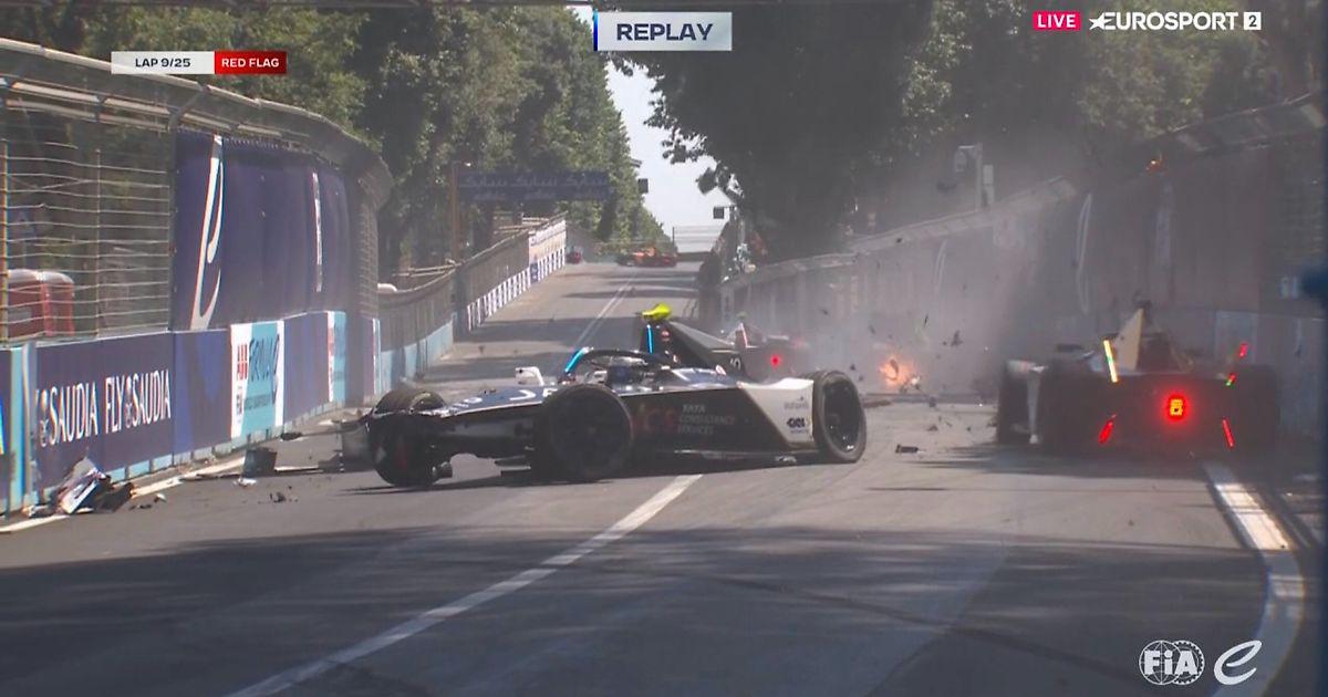 Позже гонку остановили красными флагами после массовой аварии: представителя «Ягуара» Сэма Берда, лидировавшего на первых кругах, развернуло, в него врезались Себастьян Буэми («Энвижн») и Эдоардо Мортара («Мазерати»). Из-за повреждений, полученных в последовавших за этим инцидентах, также сошли Робин Фряйнс («Абт»), Антониу Феликс да Кошта («Порше») и Лукас ди Грасси («Махиндра»).