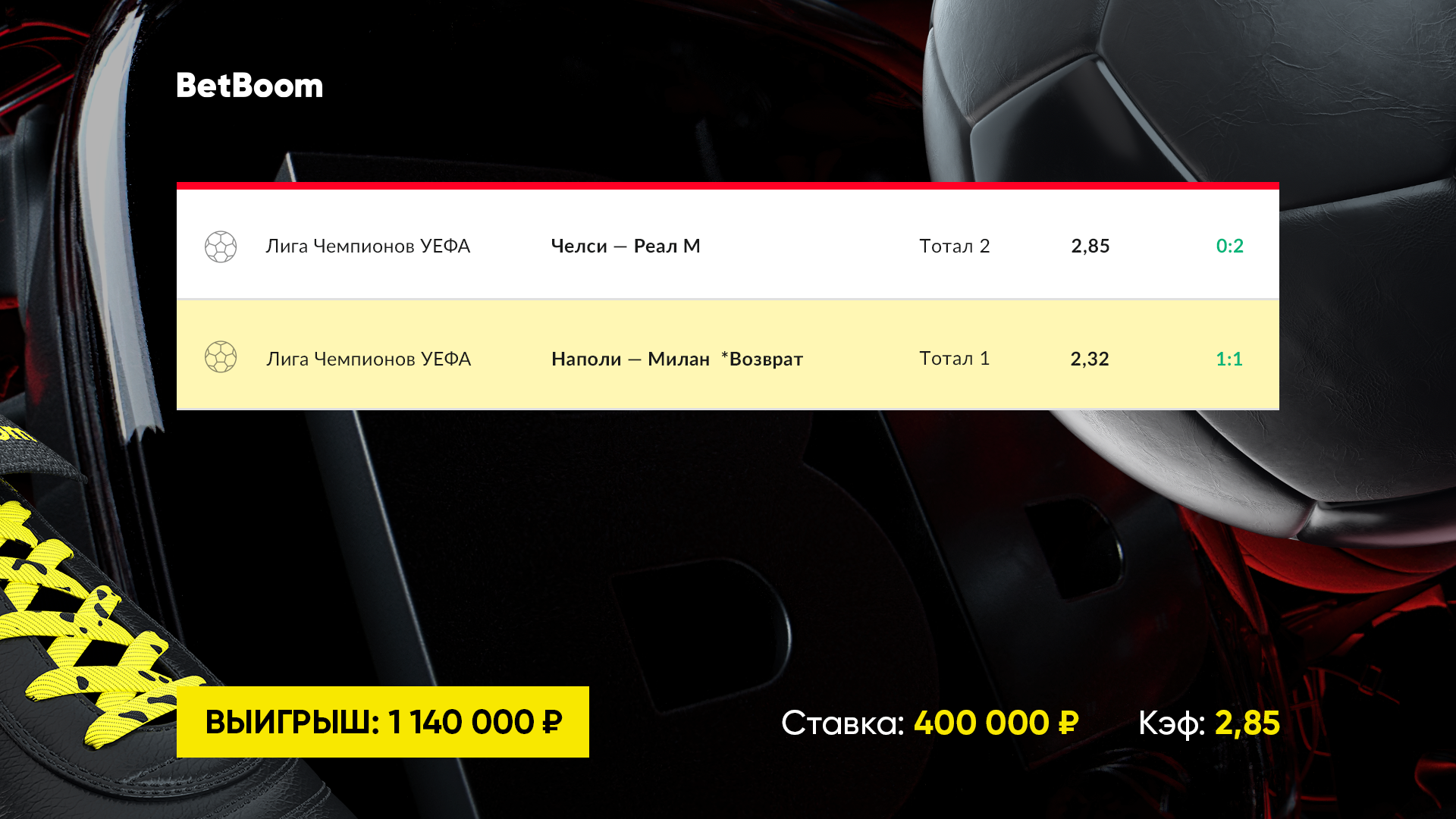 За последние 6 месяцев клиенты BetBoom были свидетелями захватывающих побед и невероятных выигрышей. Удачные экспрессы превратили их в миллионеров и оставили незабываемый след в истории букмекерской компании.