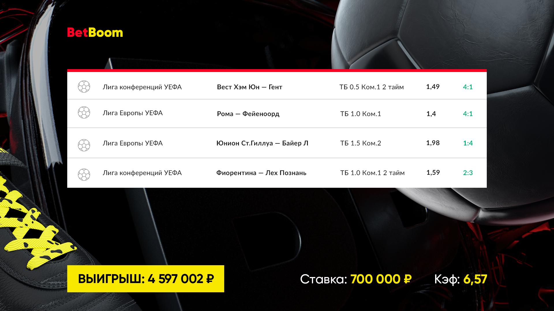 Один из клиентов букмекерской компании BetBoom решил испытать удачу, собрав экспресс из четырех событий с общим коэффициентом 6.57. Поставив 700 000 рублей, он смог выиграть невероятную сумму в размере 4 597 002 рублей. Этот успешный экспресс оказался удачным шагом для клиента BetBoom, принеся ему значительный финансовый прирост.