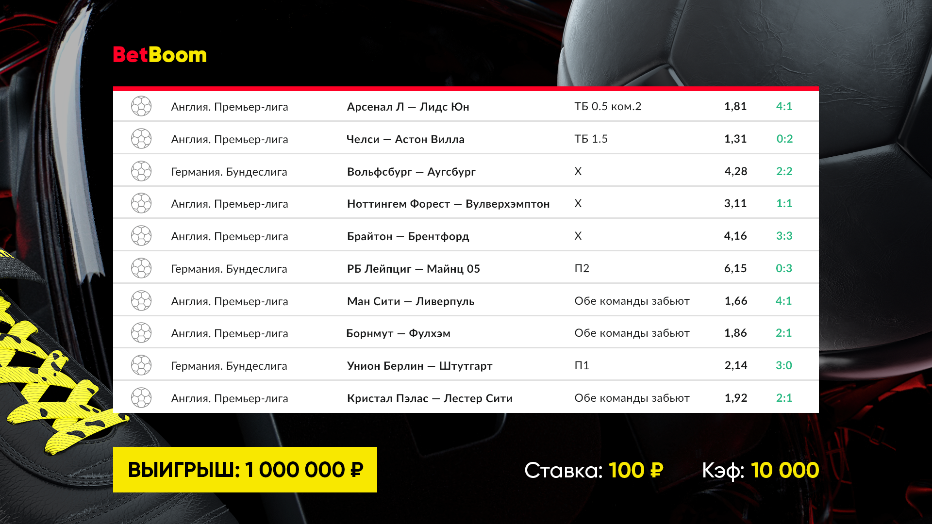 Еще один клиент BetBoom стал миллионером благодаря своей удачливой ставке на европейские кубки. Он собрал экспресс из 10 событий с невероятным коэффициентом 10 000 и вложил всего 100 рублей. Это рискованная ставка окупилась, и клиент получил громадный выигрыш в размере 1 миллиона рублей. Эта история показывает, что даже с небольшой суммой можно достичь невероятных результатов, если делать правильные прогнозы.