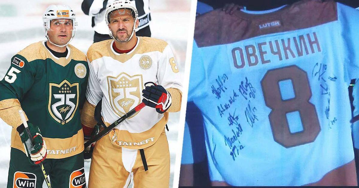 На благотворительном аукционе продали белый свитер с золотыми номерами и фамилией Овечкина, а также автографами капитана «Вашингтона», Ильи Ковальчука и других участников прощального матча Даниса Зарипова.
