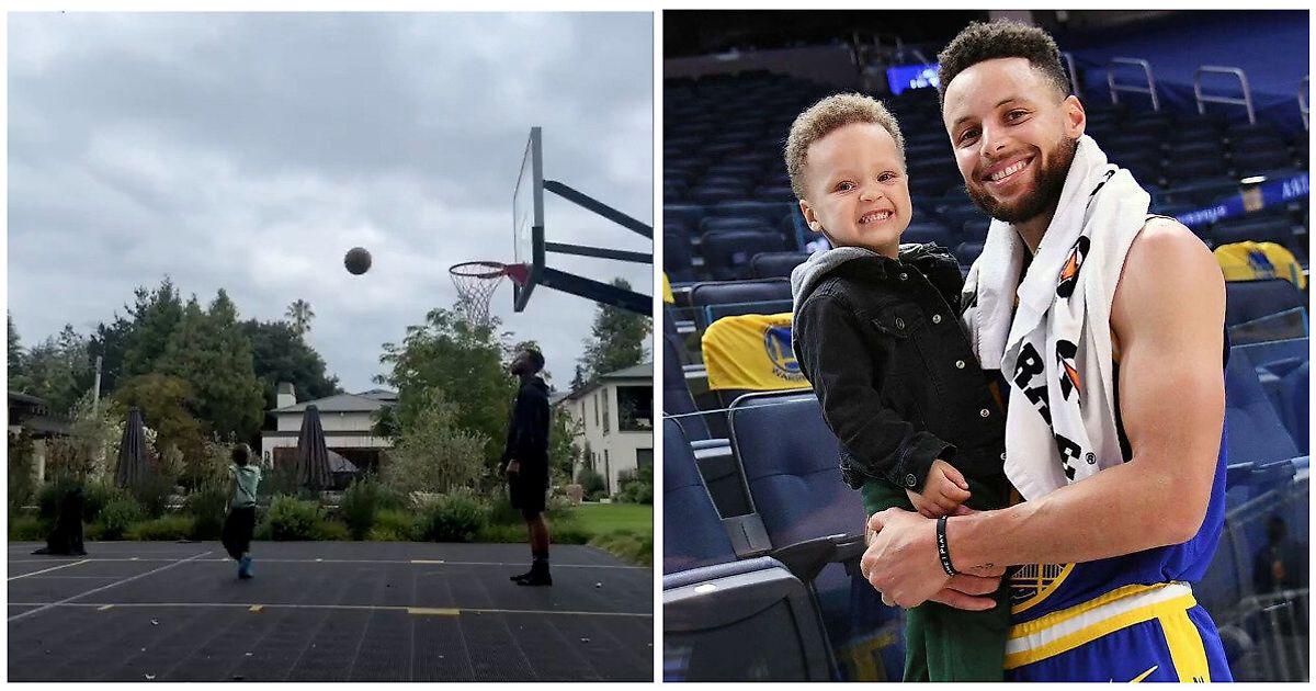 В сети появилось видео, как разыгрывающий «Голден Стэйт» Стефен Карри на уличной площадке учит сына бросать спиной к кольцу. Кэнону пять лет.