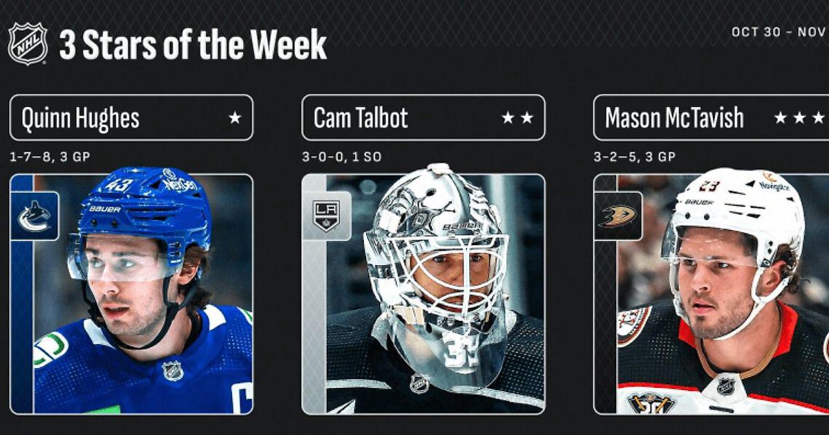 Куинн Хьюз, Кэм Тэлбот и Мэйсон Мактавиш – звезды минувшей недели в НХЛ.
