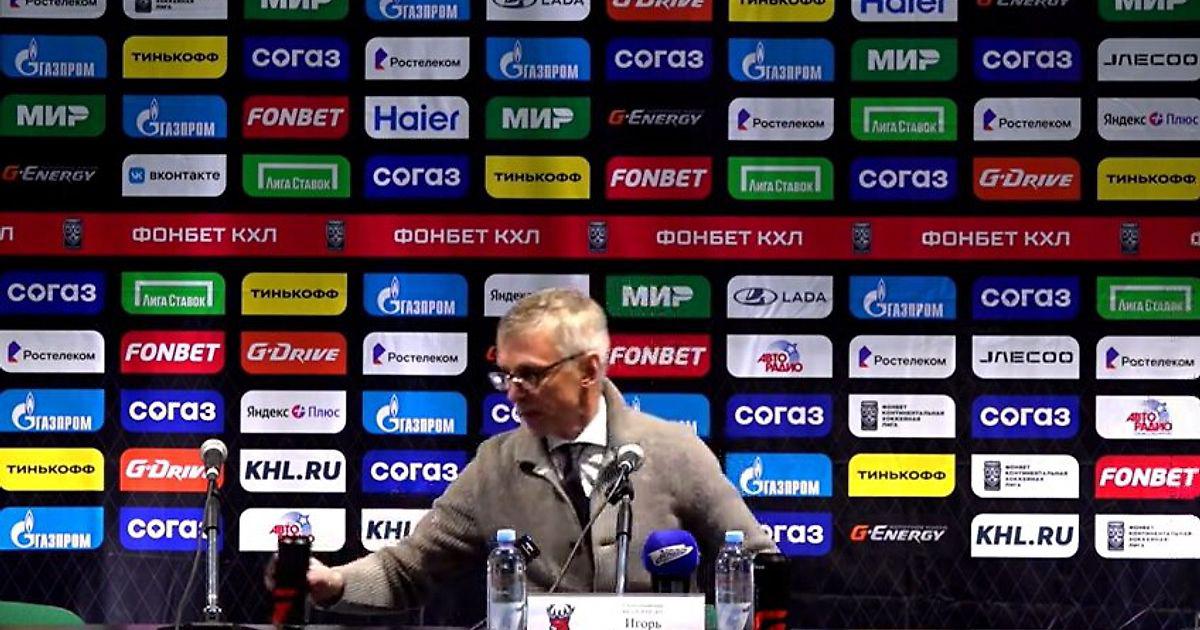 Тренер «Торпедо» Ларионов отодвинул от себя банки с энергетиком на пресс-конференции после игры со СКА