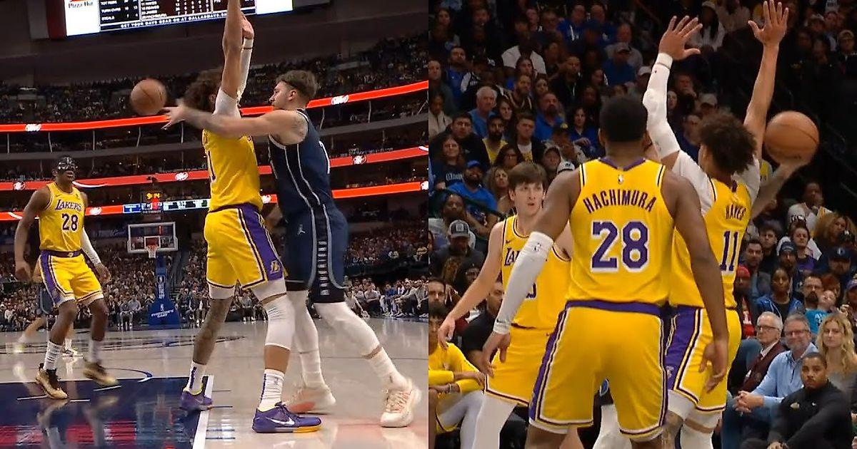 Разыгрывающий «Далласа» Лука Дончич отметился эффектной результативной передачей во время матча с «Лейкерс» (127:125).