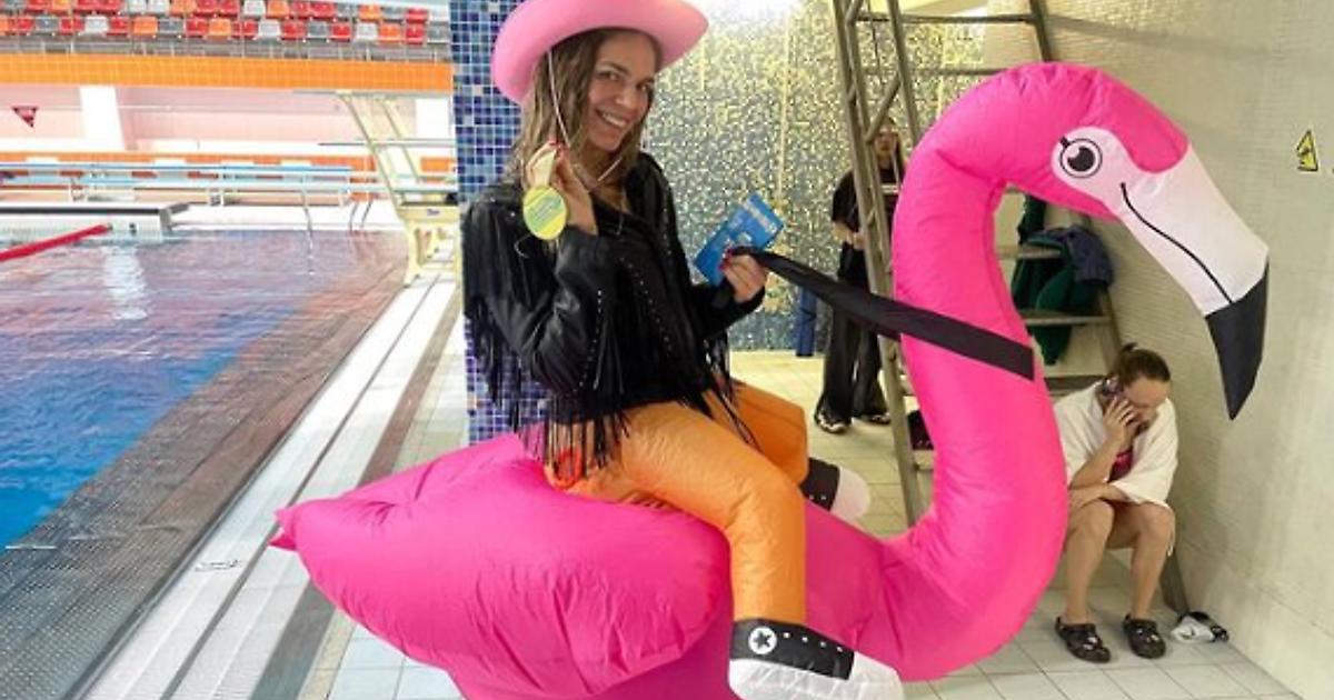 Сначала я увидела фламинго, потом в машине у подружки нашла шляпу, а сегодня пришла идея надеть куртку и парик. Так наряд и собрали», – сказала шестикратная чемпионка мира по плаванию Ефимова.