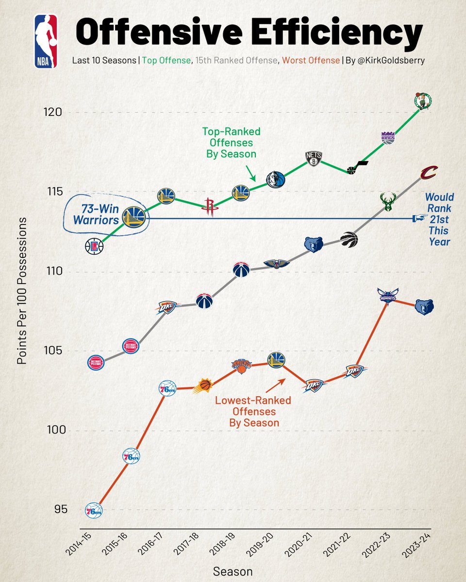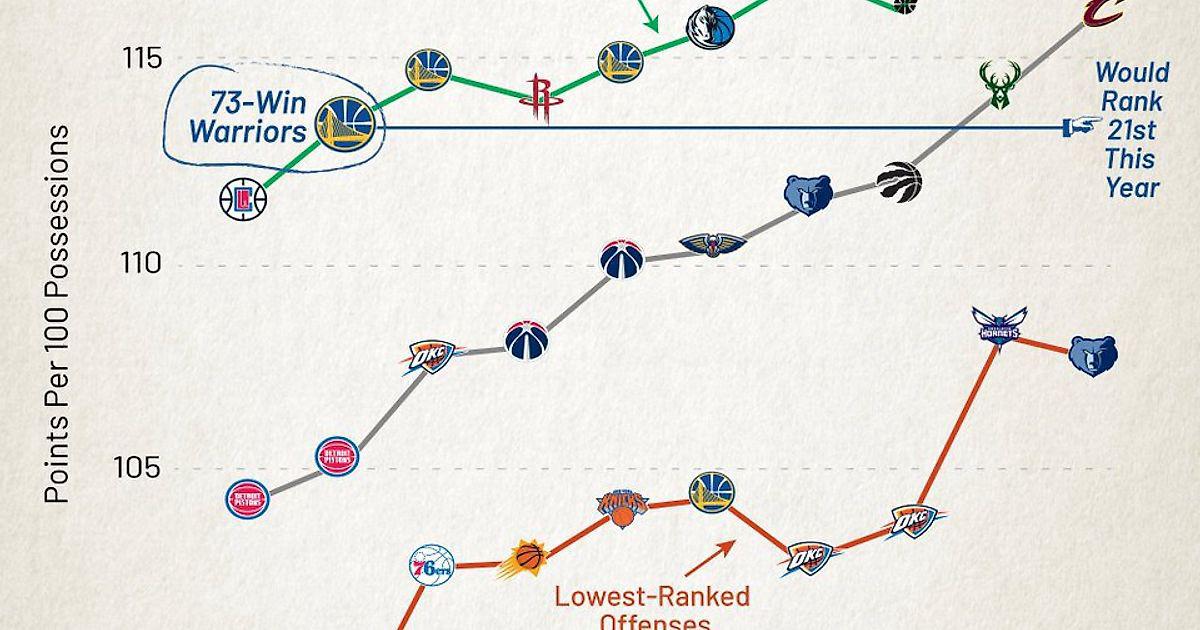 Эксперт сравнил нападение «Голден Стэйт», который выиграл 73 матча в регулярном сезоне, и атаки клубов лиги в этом сезоне. Атака «Уорриорс» в сезоне-2015/16 была лучшей в лиге, но по эффективности оказалась бы на 21-м месте сейчас, уступив атаке «Торонто», идущих с показателями 19-36.