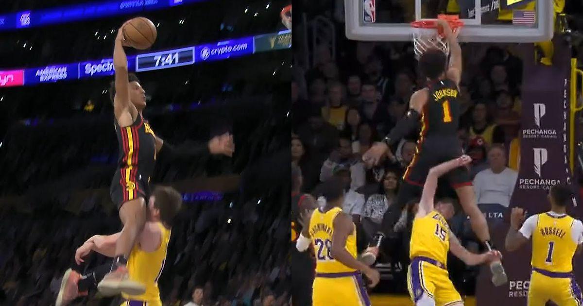 Во время данка форвард «Атланты» почти перепрыгнул через игрока «Лейкерс».