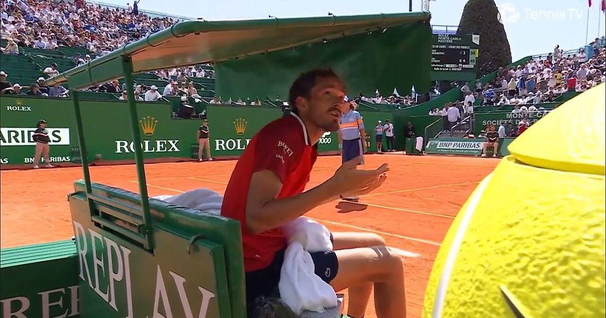 Даниил Медведев поспорил с судьей на вышке Карлосом Бернардесом и супервайзером Седриком Мурье в третьем круге в Монте-Карло.