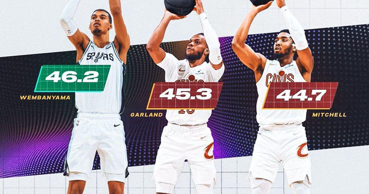 Вембаньяма реализует 46,2% подобных бросков. На втором месте разыгрывающий «Кливленда» Дариус Гарлэнд (45,3%). Замыкает тройку защитник «Кавальерс» Донован Митчелл (44,7%).