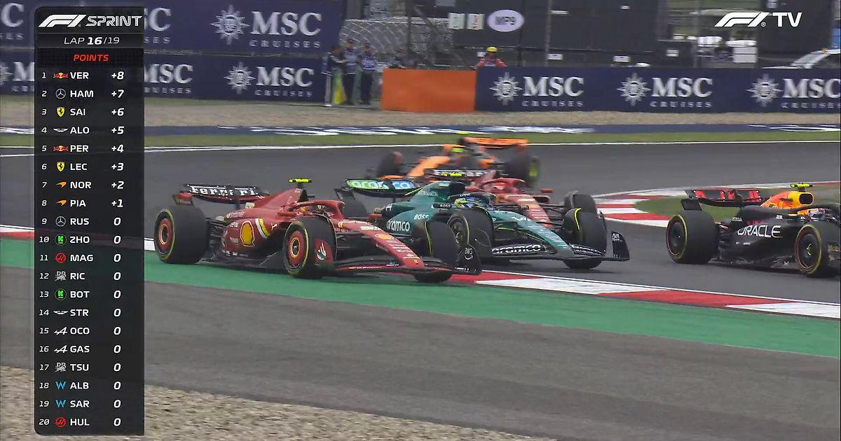 Гонщик «Астон Мартин» Фернандо Алонсо дошел до контакта с соперником из «Феррари» Карлосом Сайнсом в спринте на Гран-при Китая.
