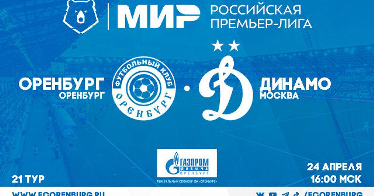 В 21 туре Мир РПЛ «Оренбург» принимает «Динамо». Матч пройдет 24 апреля, в 18:00 по местному времени на стадионе «Газовик».